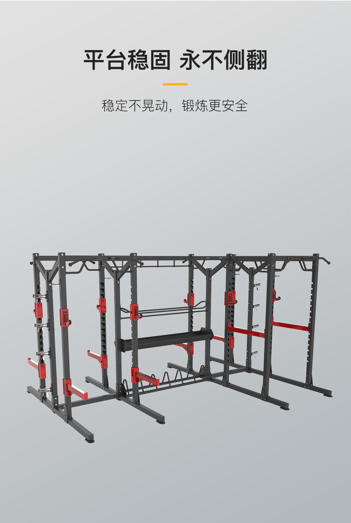 前开放式深蹲架功能模块+多功能深蹲架功能模块+组合单排收纳模块+多功能链接附件+单杠链接附件+杠铃片储存链接附件+自由储存链接附件+球类储存链接附件